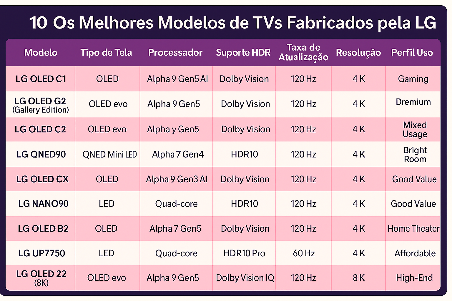 A LG segue liderando o mercado de televisores com uma variedade de modelos que atendem desde o consumidor casual até o mais exigente. A marca investe constantemente em tecnologia de ponta, com destaque para seus painéis OLED, MiniLED e QNED. Se você está pensando em comprar uma TV LG, qualquer um dos modelos listados neste artigo será uma excelente escolha, dependendo do seu perfil de uso e, é claro, se você ainda encontrar esses modelos no mercado, em função de alguns deles já terem sido descontinuados pela marca.